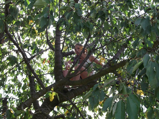 ve výškách - ještě že máme štafličky. Nikdo nemá tušení, co se vlastně děje, ale baví je to a o to jde. Vybarvují překvapení. Později vedeme skupinky dětí kolem zmalovaných stromů. Ve chvíli, kdy se obraz spojí v auto, je pojednou les plný výkřiků překvapení. Nádhera. Mezitím je rozehrán nohejbal. V Praze stříhá pan Barák Lenoru (díky Vláďo!).